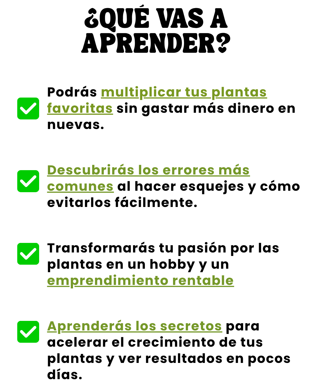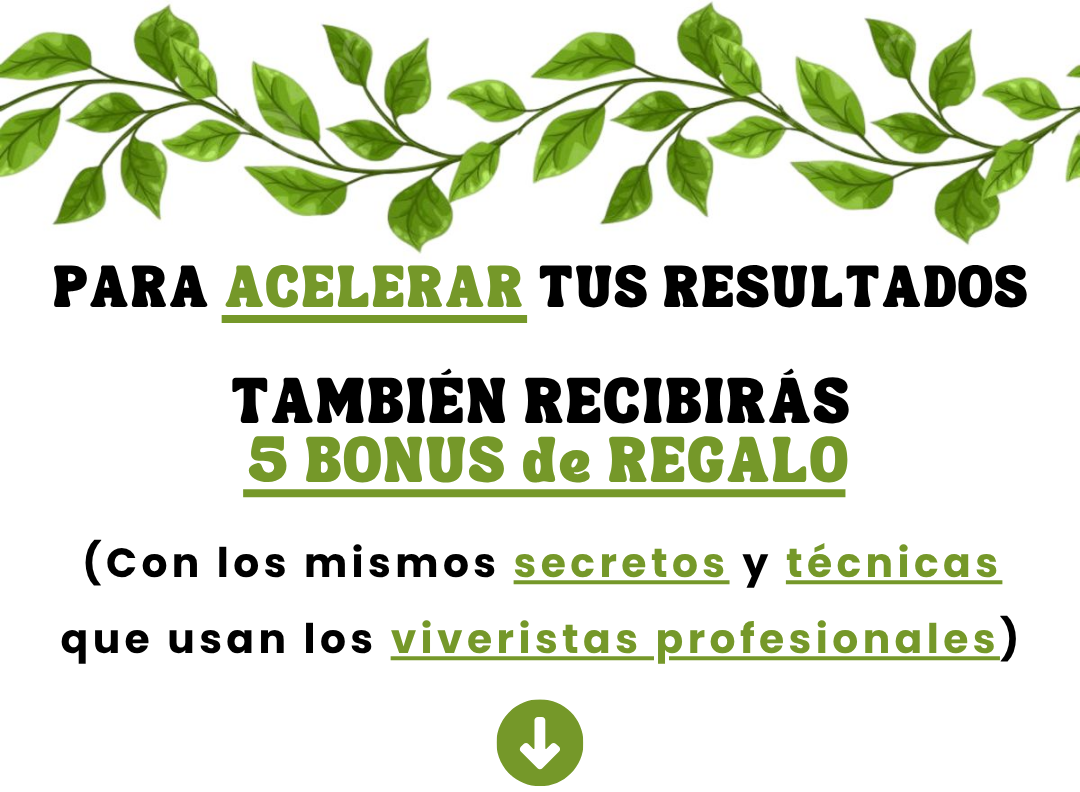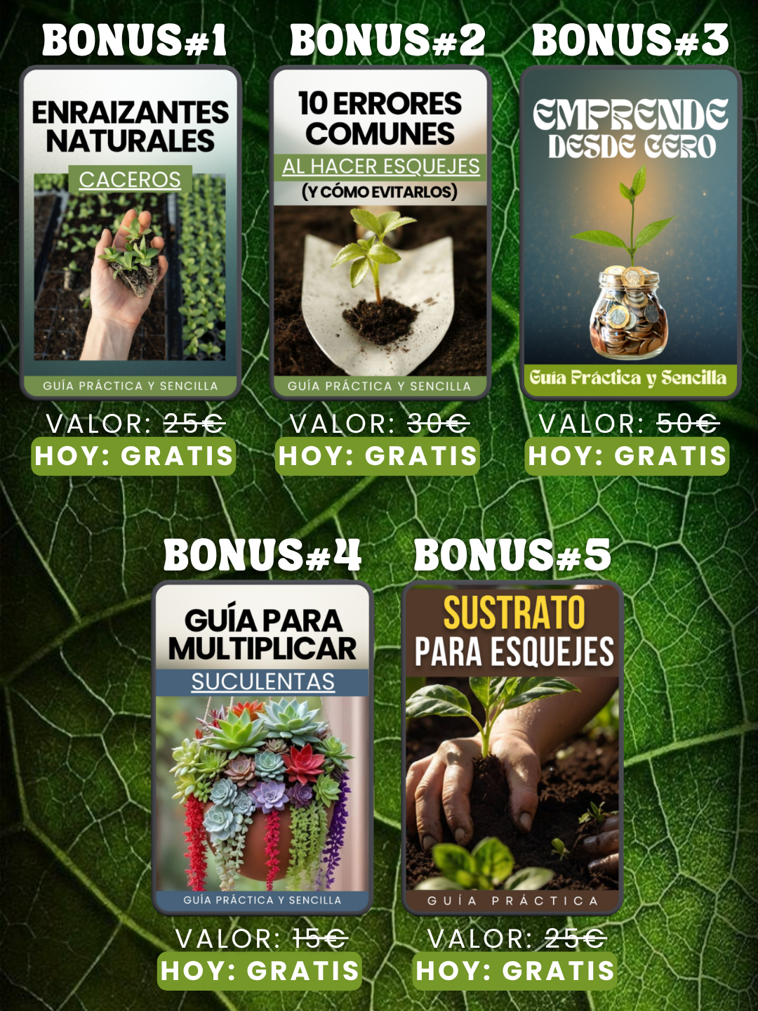 Recibirás el ebook digital “Cómo Hacer Esquejes”, una guía completa paso a paso donde aprenderás a multiplicar hasta 100 plantas nuevas en menos de 7 días desde tu casa. Más todos los Bonus que tenemos de regalo para ti.